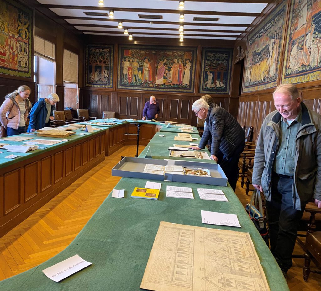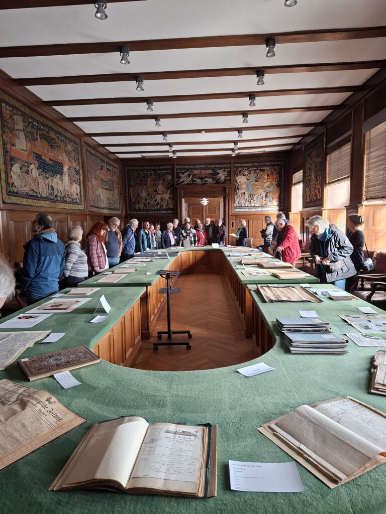 Offiziell eröffnet wurde die Veranstaltung von Landrat Dr. Mager. Frau Dr. Mührenberg, die Leiterin des Fachdienstes Museen und Kreisarchiv, gab anschließend eine Einführung in die Ausstellung. In insgesamt drei Führungen im Historischen Sitzungssaal durch Kreisarchivarin Kerstin Letz konnten dann zum einen der beeindruckende Saal mit den phantastischen Wandteppichen von Wanda Bibrowicz bewundert werden. Zum anderen präsentierte dort das Kreisarchiv einzigartige Archivalien, welche die bewegte Geschichte des Kreises dokumentieren, unter anderem die Original-Gründungsurkunde der Ritter- und Landschaft von 1585 – jener politischen Kraft, die das Herzogtum Lauenburg über drei Jahrhunderte lang bis zur Kreisgründung maßgeblich prägte.