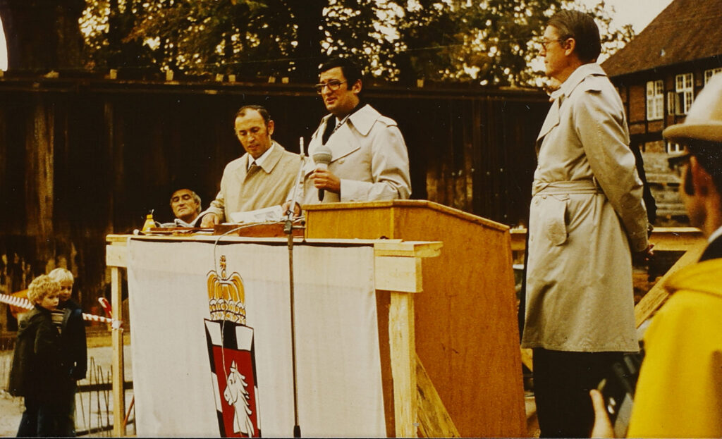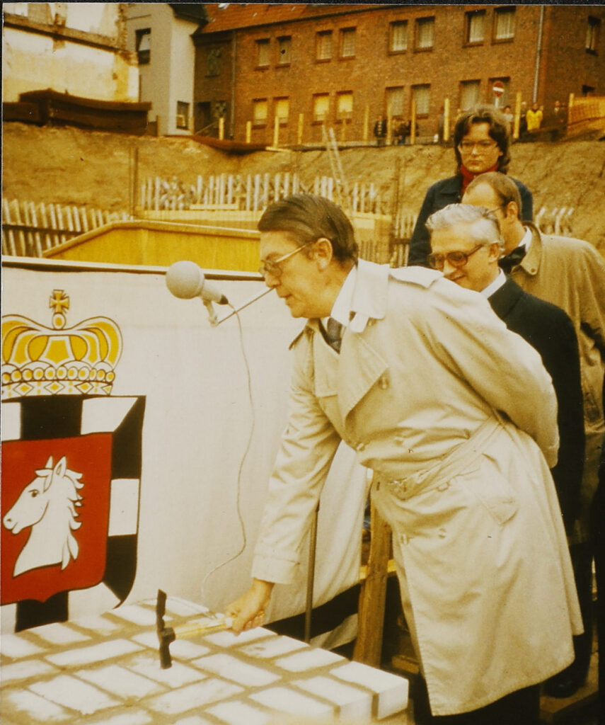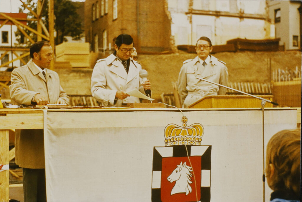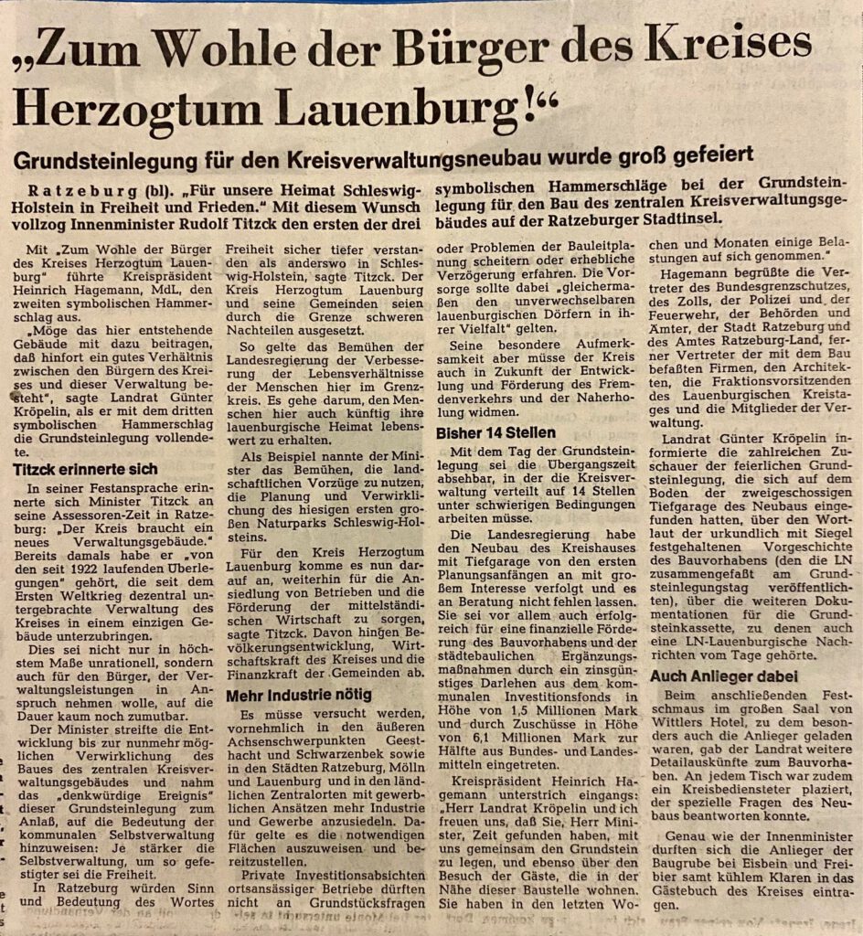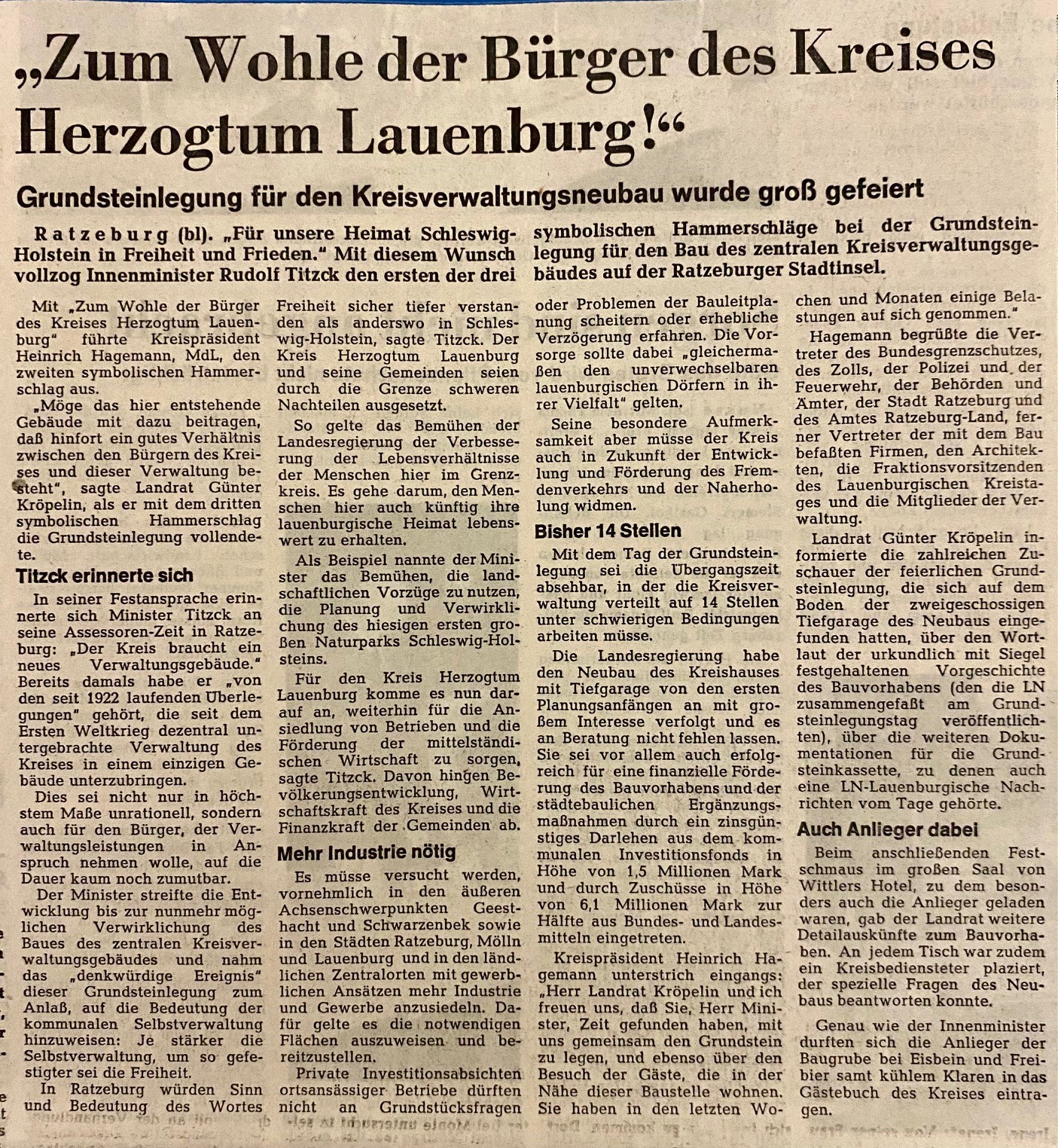 Am 5. Oktober 1977 nahm der Innenminister des Landes Schleswig-Holstein Rudolf Titzck die feierliche Grundsteinlegung vor. Die weiteren symbolischen Hammerschläge führten Kreispräsident Heinrich Hagemann und Landrat Günter Kröpelin aus. In ihren Ansprachen informierten sie die zahlreichen Gäste über die Bedeutung der kommunalen Selbstverwaltung, die Vorgeschichte des Baus und seine Notwendigkeit und Finanzierung. Anschließend wurde gebührend im großen Saal von Wittlers Hotel gefeiert. Nachfolgend dokumentiert eine Auswahl von Fotografien das Geschehen. Übrigens: Wer die Baustelle des jetzigen Erweiterungsbaus gesehen hat, wird zweifelsfrei Gemeinsamkeiten entdecken.