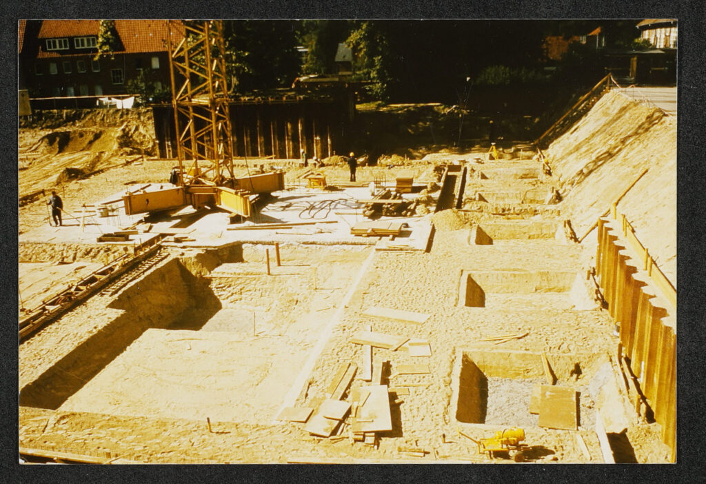 53 Fotos mit Abbildungen von Abbrucharbeiten, von der Grundsteinlegung, von Bauabschnitten und Bauverlauf, vom Richtfest, Ansichten der Außenfassade und von Seiten der Herrenstraße, Ansichten der Heizungstechnik und Deckenverkleidung und vom Modell des Neubaus; 75 Negative