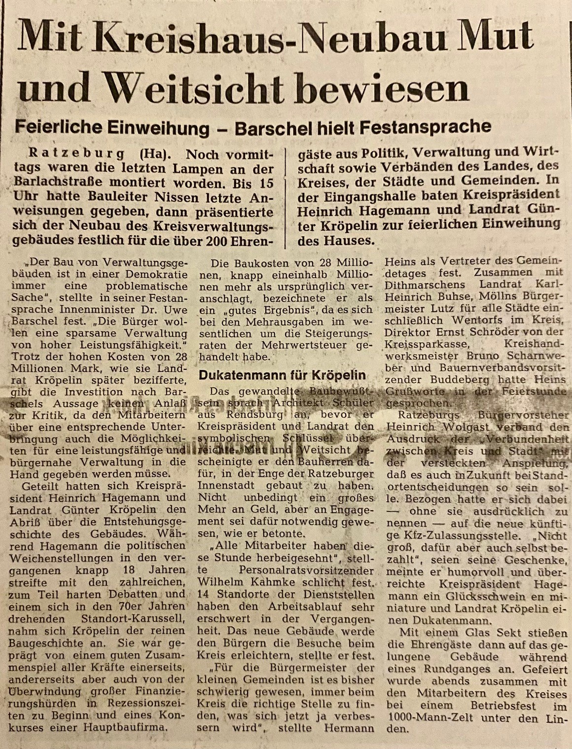 Im Herbst 1980 konnte das Großprojekt abgeschlossen werden. Der Kreis Herzogtum Lauenburg weihte am 10. Oktober 1980 sein neues Verwaltungsgebäude Barlachstraße 2 auf der Ratzeburger Insel ein. Der Neubau umfasste 184 Büroräume, vier Sitzungs- und Besprechungszimmer, 21 Akten- und Archivräume, 22 technische Räume, zwei Therapieräume sowie eine Kantine mit 120 Sitzplätzen. Die Festansprache zur feierlichen Einweihung des Hauses hielt Innenminister Dr. Uwe Barschel. Abends wurde zusammen mit Mitarbeiterinnen und Mitarbeitern in einem Festzelt Unter den Linden gefeiert. Zu einem Tag der offenen Tür am 29. November 1980 konnten Bürgerinnen und Bürger die Gelegenheit wahrnehmen, die neuen Räumlichkeiten der Kreisverwaltung zu besichtigen.