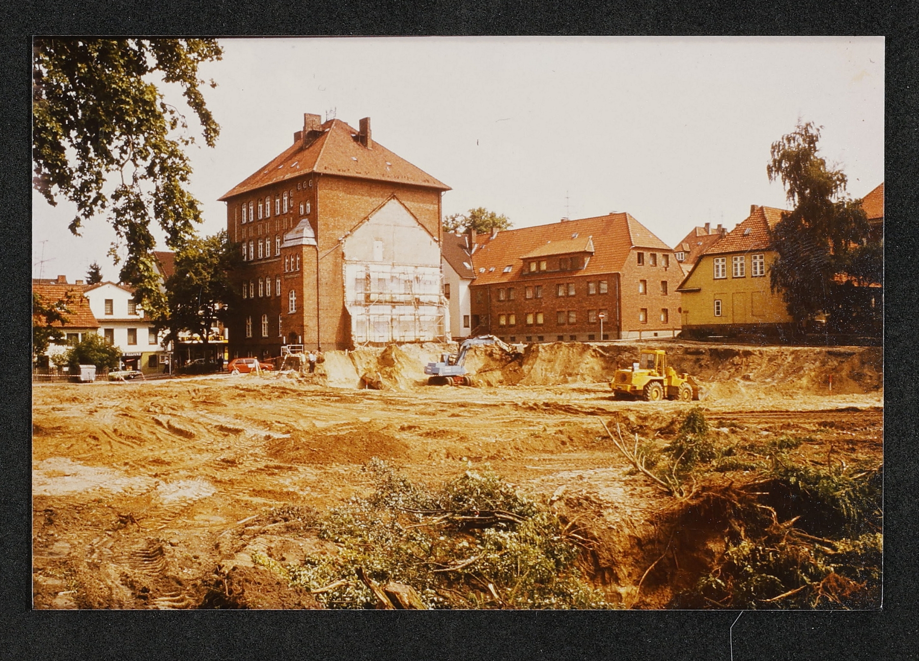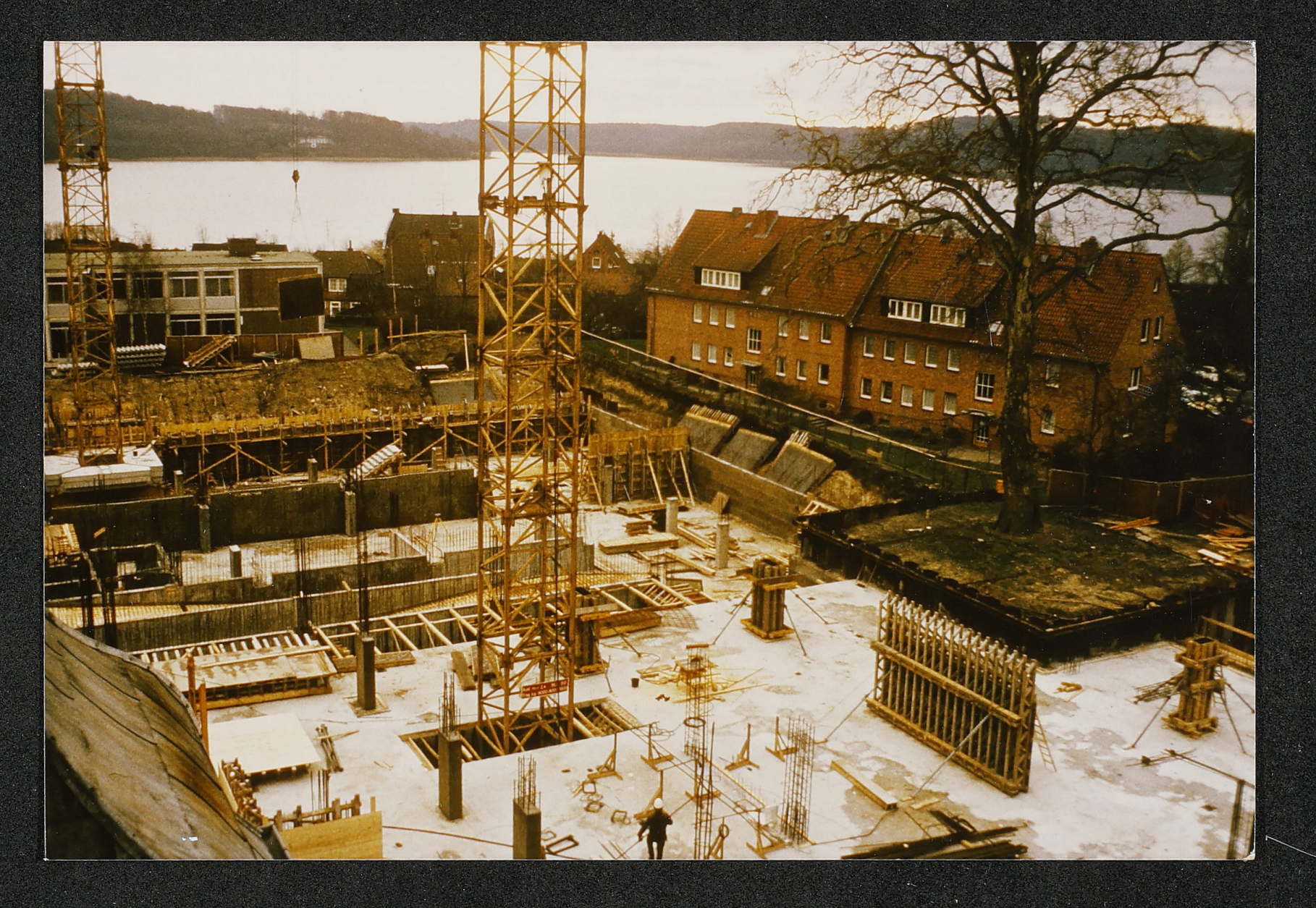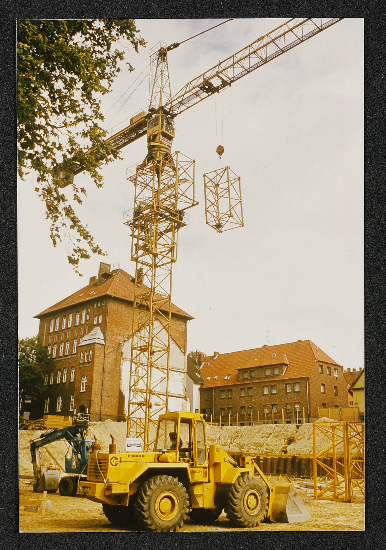 Die Akte enthält 53 Fotos mit Abbildungen von Abbrucharbeiten, von der Grundsteinlegung, von Bauabschnitten und Bauverlauf, vom Richtfest, Ansichten der Außenfassade und von Seiten der Herrenstraße, Ansichten der Heizungstechnik und Deckenverkleidung und vom Modell des Neubaus sowie 75 Negative.